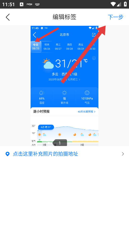 3、进入编辑标签页面,可补充拍摄地址等信息,确认后点击右上角下一步,完成实景照片上传操作。