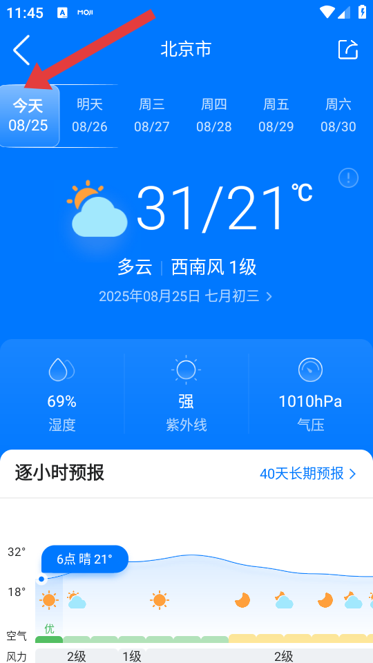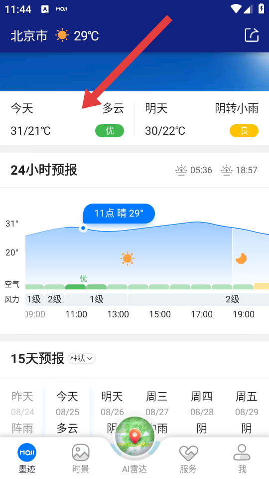 1、打开墨迹天气APP主界面,点击今天天气区域如显示今天多云31/21℃”的卡片,进入当日天气详情页。
