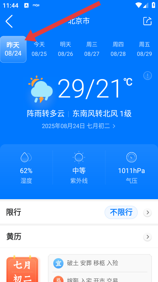 2、在天气详情页顶部的日期导航栏中,向左滑动查看如08/24等历史日期,切换至对应日期的天气页面。
