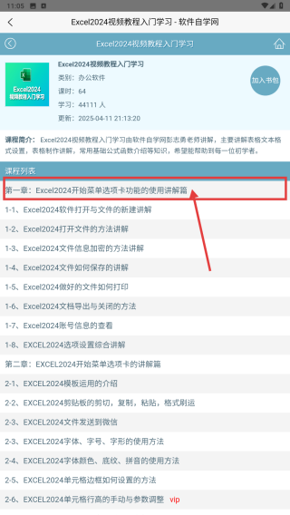 2、在课程详情页,选择第一章第一节Excel2024软件打开与文件的新建讲解,进入该节内容页。
