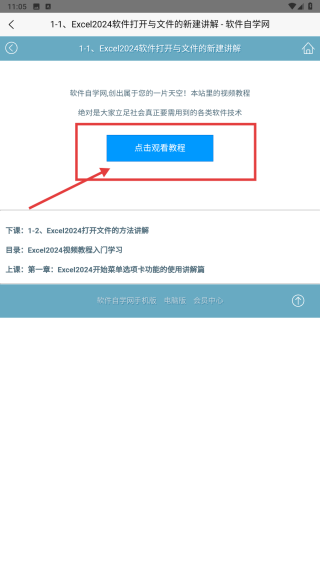 3、在内容页,点击点击观看教程按钮,开始学习该节Excel2024教程内容。