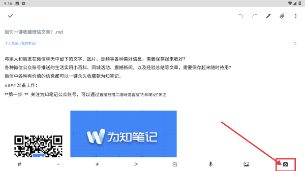 3、在编辑模式下,点击右下角相机图标,可选择插入图片等内容,完成编辑后保存笔记。