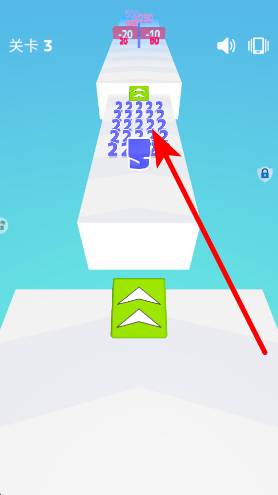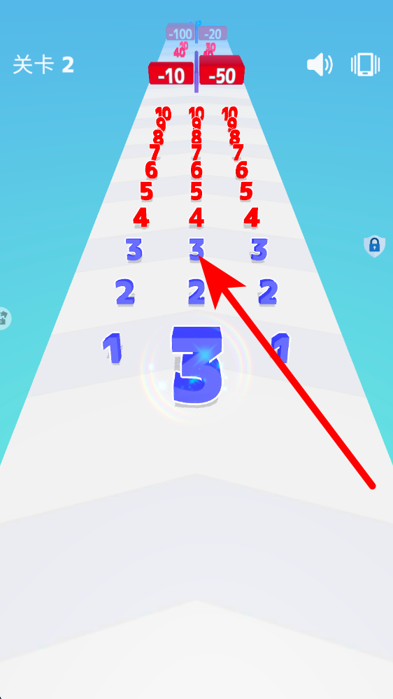 1、数字收集策略,优先奔赴同色、数值更小的数字,关卡2中蓝色3,避开红色减10减50等减益数字,逐步积累数值,为关底对比蓄力。