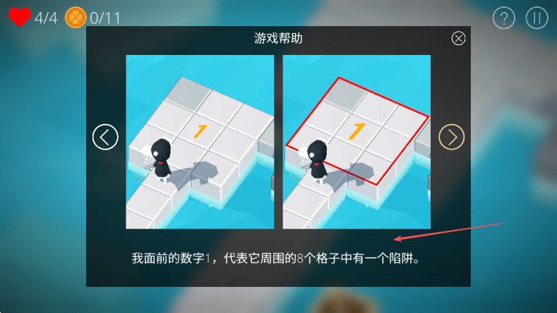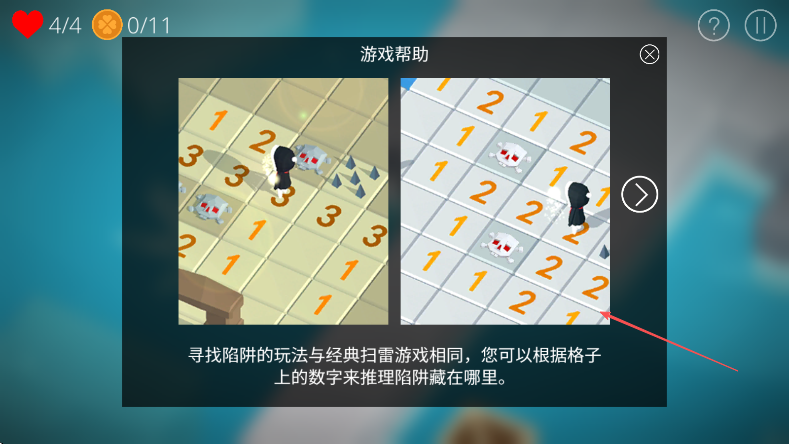 1、游戏中寻找陷阱玩法和经典扫雷类似,依据格子上的数字,像1,2,3等,来推理陷阱位置。