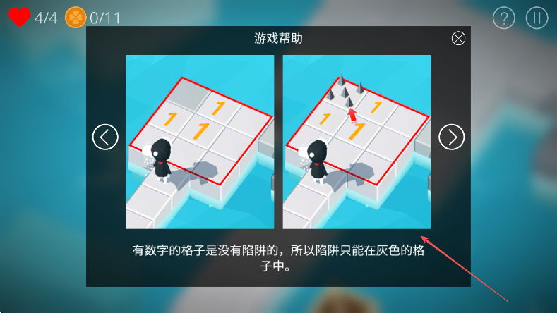 3、有数字的格子无陷阱,陷阱只在灰色格子中,通过推理规划路线,避免踩中陷阱,完成迷宫探索。