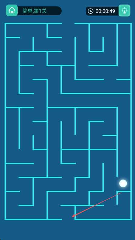 3、持续探索,避开死路,朝着迷宫出口前进,尽量在短时间内完成关卡,像00:00:49时争取接近或抵达出口。