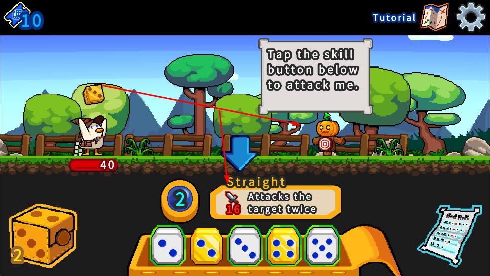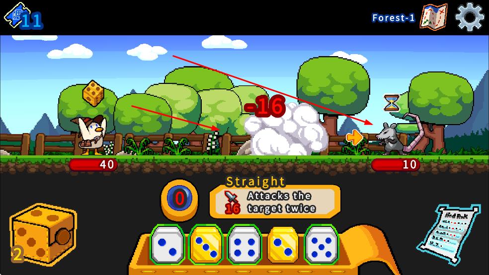 2、点击下方技能按钮发起攻击,在Forest-1等关卡中,对战老鼠等敌人,利用骰子技能造成伤害。