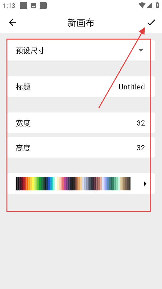 2、进入新画布页面,设置好预设尺寸,标题,宽度,高度等参数后,点击右上角对勾。