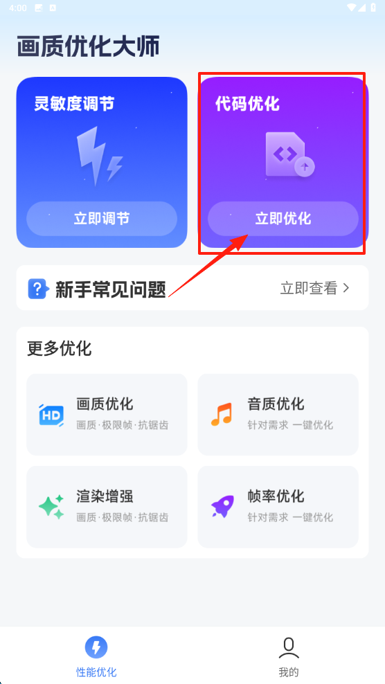 1、打开画质优化大师应用,点击代码优化板块的立即优化按钮,进入代码操作页。