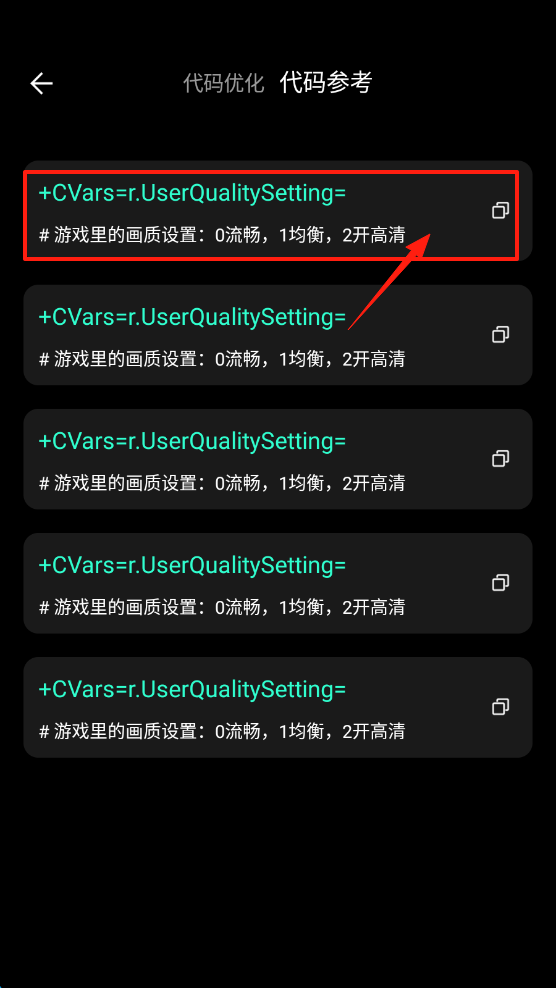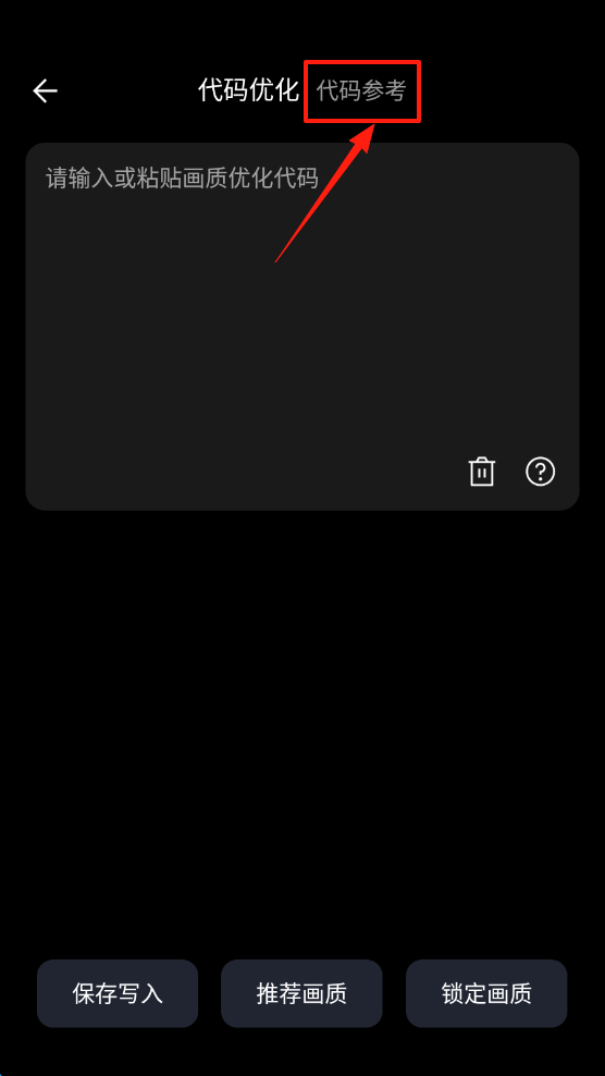 2、在代码优化页面,点击顶部代码参考选项,查看可用画质代码。