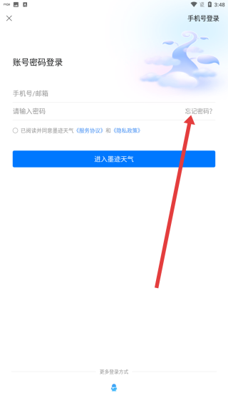1、在墨迹天气账号登录界面中,若忘记密码,可以点击忘记密码按钮进行找回。