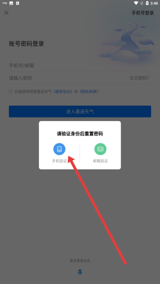 2、在点击忘记密码按钮后,选择弹窗中的手机验证选项进行找回。