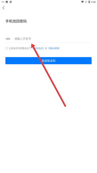 3、在手机找回密码页面中,需输入手机号以便发送验证码找回密码。