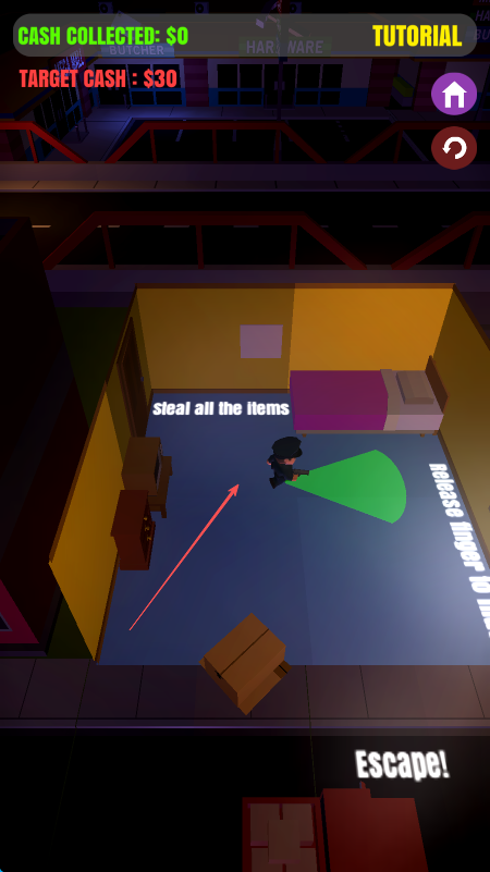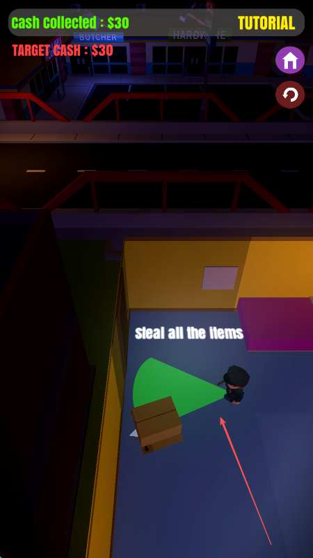 1、进入游戏留意屏幕上方CASHCOLLECTED显示的收集现金数和TARGET CASH目标现金数,操控角色按steal all the items提示偷取物品获取现金。