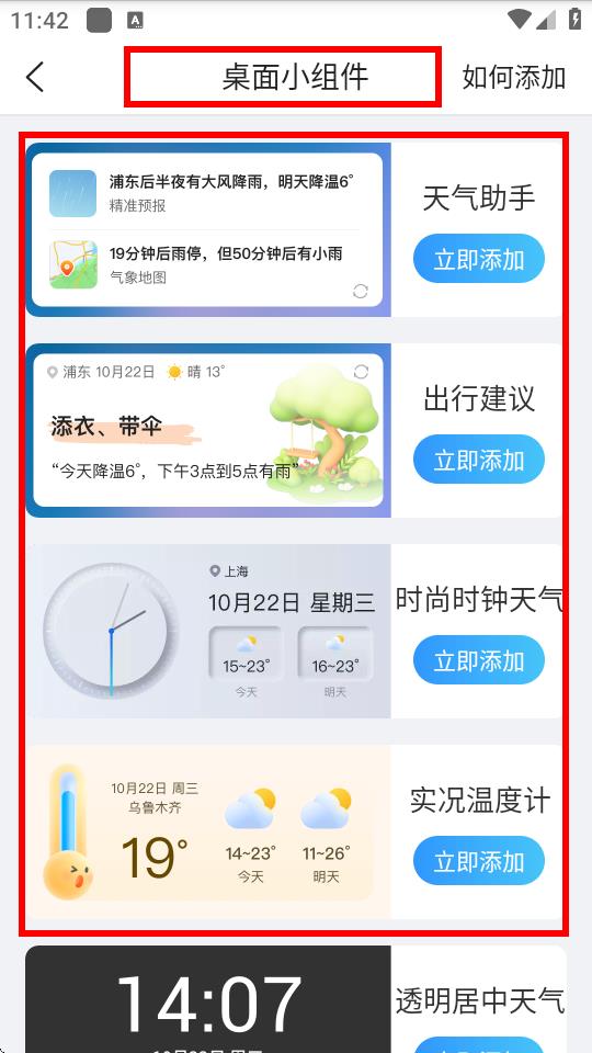 3、进入桌面小组件页面后,选择喜欢的小组件样式,点击对应的立即添加按钮,显示在手机桌面。