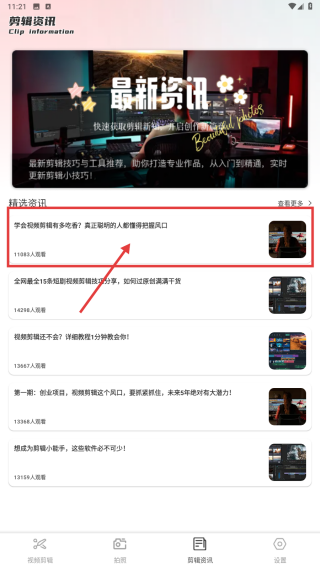 1、打开视频编辑类APP,点击底部剪辑资讯选项,进入剪辑资讯页面。
