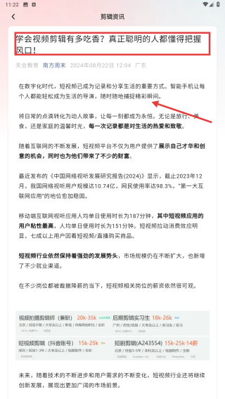 3、在资讯详情界面,查看学会视频剪辑有多吃香?真正聪明的人都懂得把握风口!资讯的具体内容。