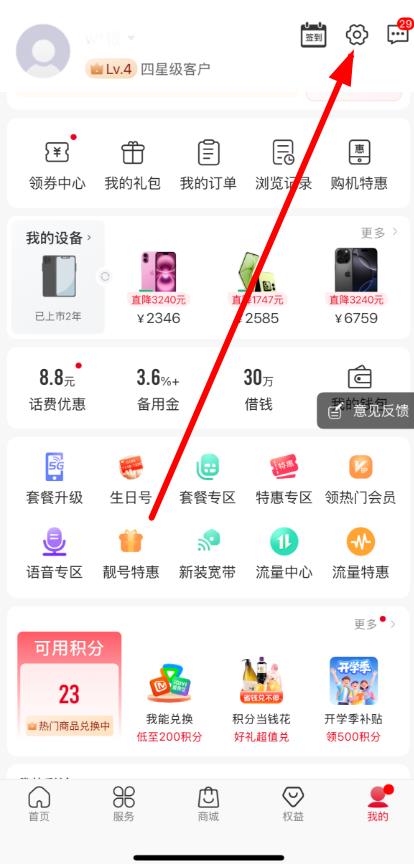 1、打开中国联通app,点击底部导航栏我的,进入个人页面,点击右上角设置图标。
