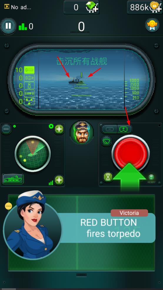 1、进入游戏后在潜艇操控界面,依据提示点击红色按钮发射鱼雷,目标是击沉所有战舰,开启海战任务。