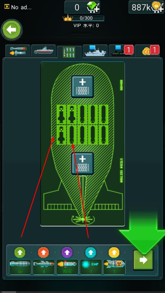 3、战斗间隙可进入潜艇内部界面,查看鱼雷等武器配置,还能开展武器升级等操作,强化潜艇战力。