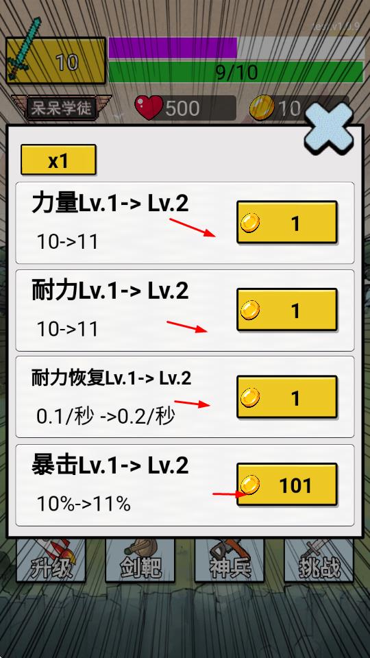 1、进入升级界面,消耗金币提升力量、耐力等属性,从Lv.1升至Lv.2,增强角色战力,为战斗与训练奠定基础。