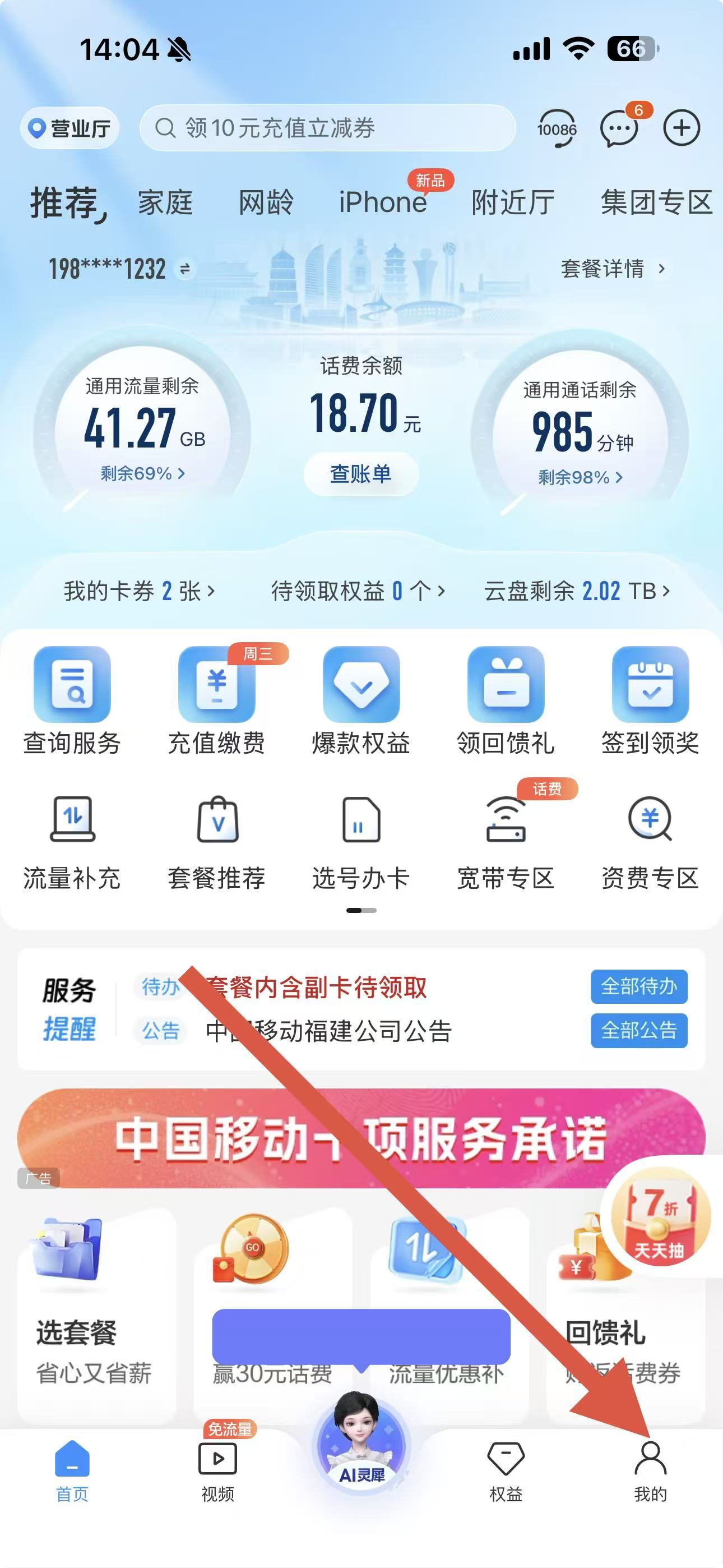 1、打开中国移动APP,点击底部导航栏中的我的选项进入个人页面。