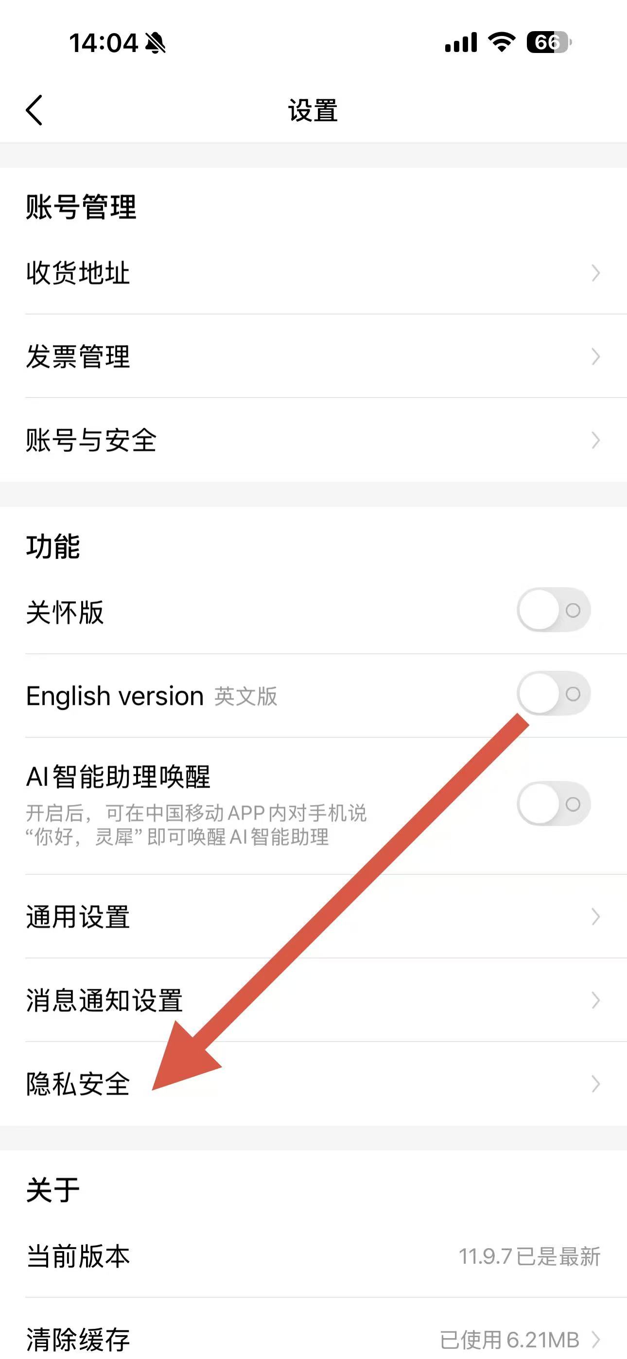 3、在设置页面里,向下滑动并点击隐私安全选项。