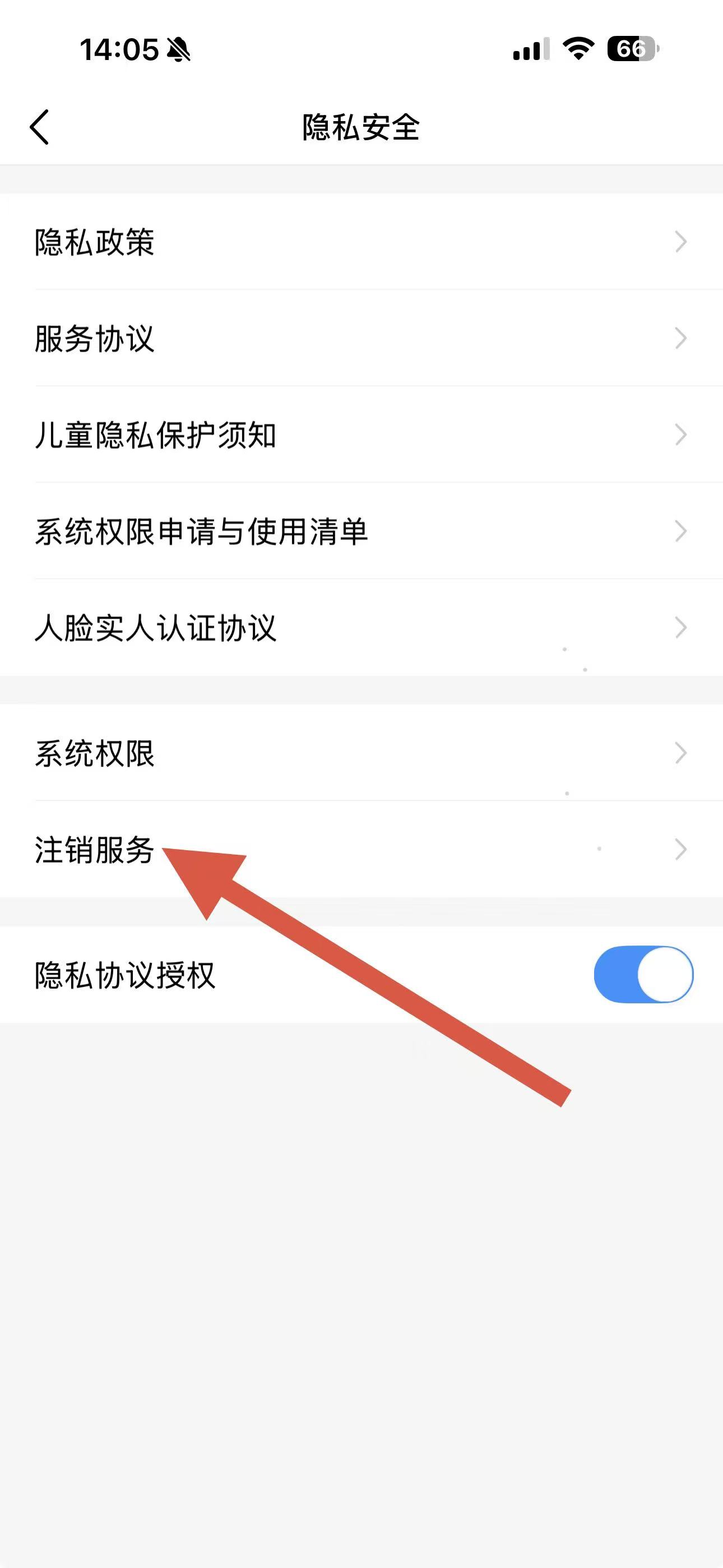 4、进入隐私安全页面后,点击注销服务,按照后续提示完成账号注销操作。