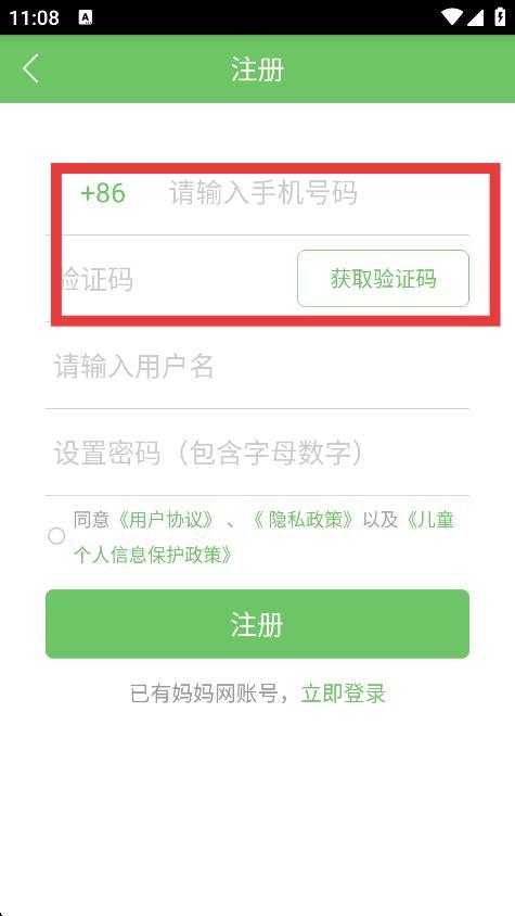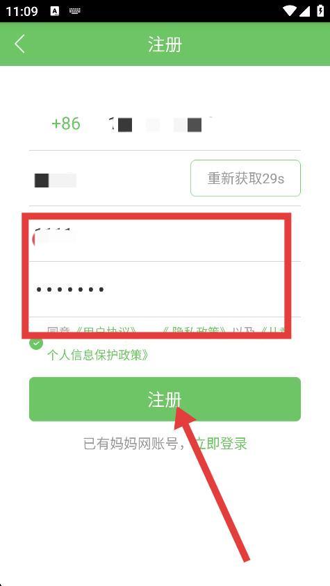 3、在注册界面,输入手机号码并填入收到的验证码。