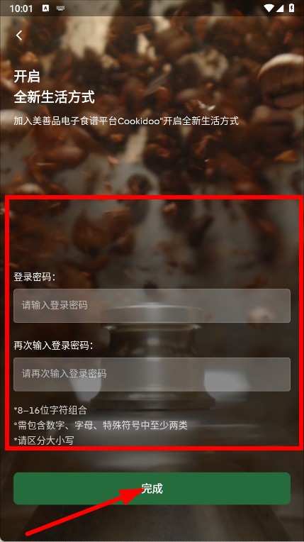 4、设置登录密码,再次输入密码后点击完成,即可完成注册。