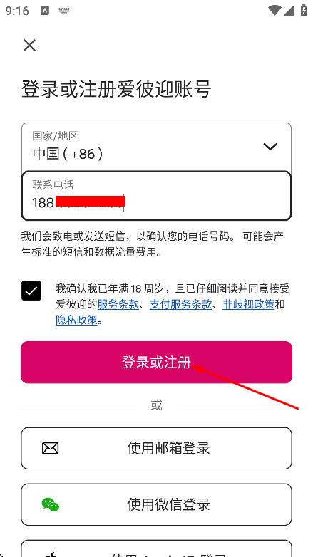 3、在登录或注册页面,输入联系电话,点击登录或注册,进入确认页面。
