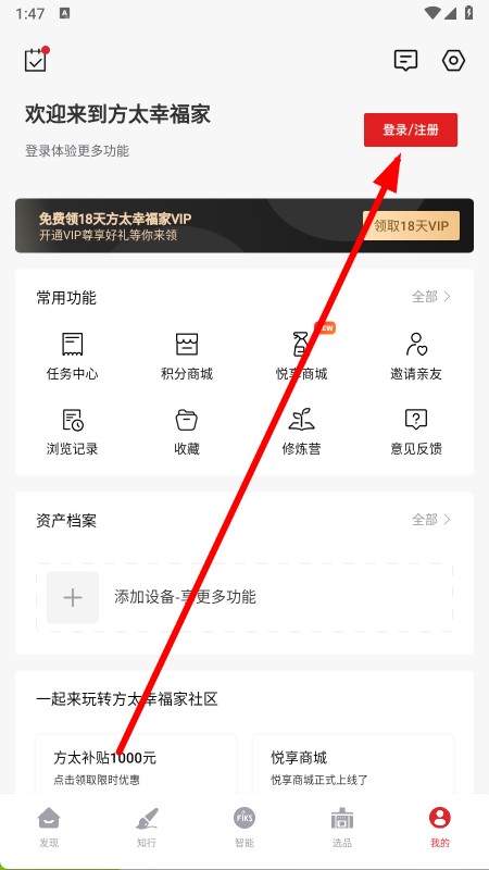 2、在个人页面,点击登录注册,进入手机号注册登录页面。