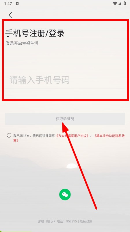 3、在注册登录页面,输入手机号码,勾选后,点击获取验证码。