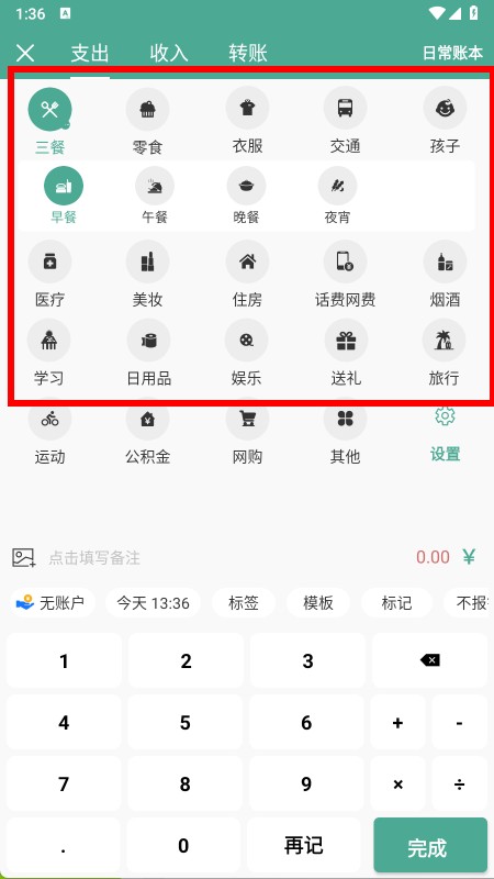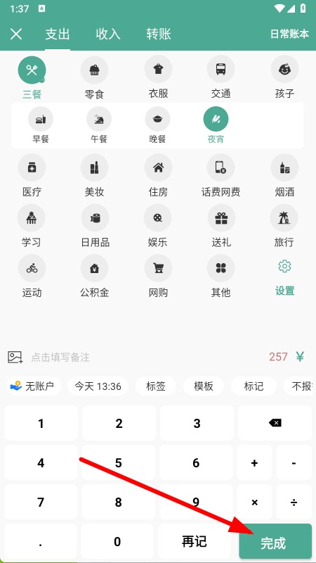 4、输入消费金额后,点击完成,即可记录一笔消费账目。