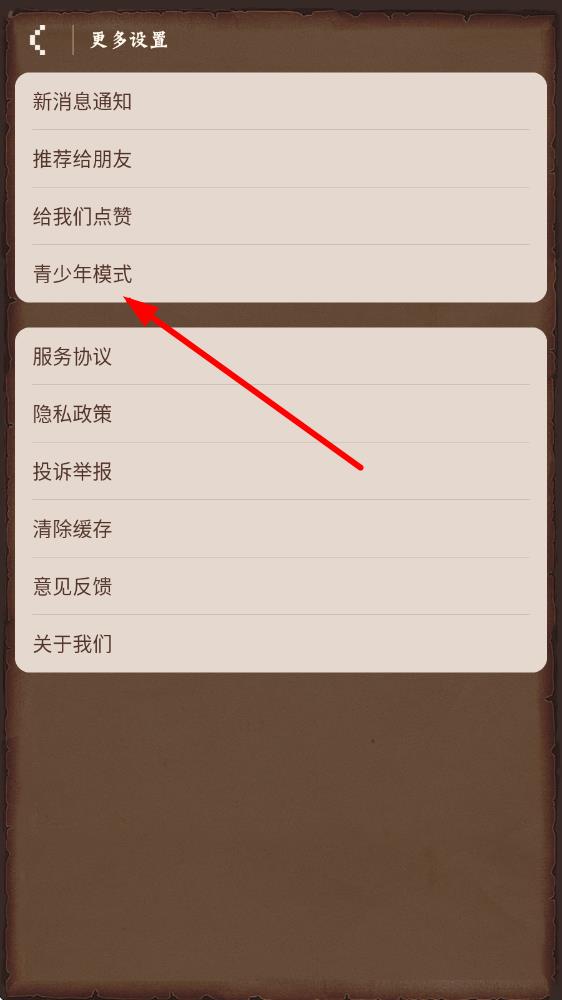 3、在设置页面里,向下滑动找到青少年模式选项,点击进入青少年模式设置界面。