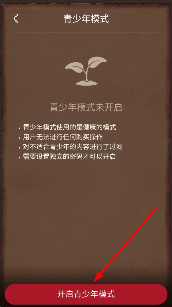 4、在青少年模式界面,点击开启青少年模式按钮,按照提示设置独立密码,即可成功开启青少年模式。