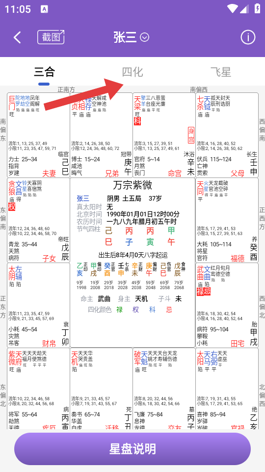 3、在紫微盘界面,点击四化标签,查看星曜四化的分布情况。