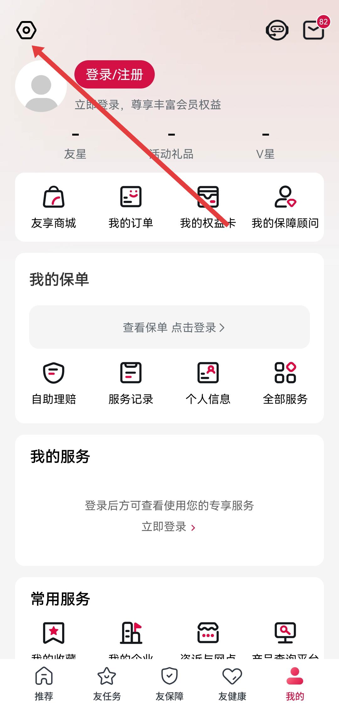 1、在友邦友享APP的首页,需要点击我的按钮,进入个人功能的页面。