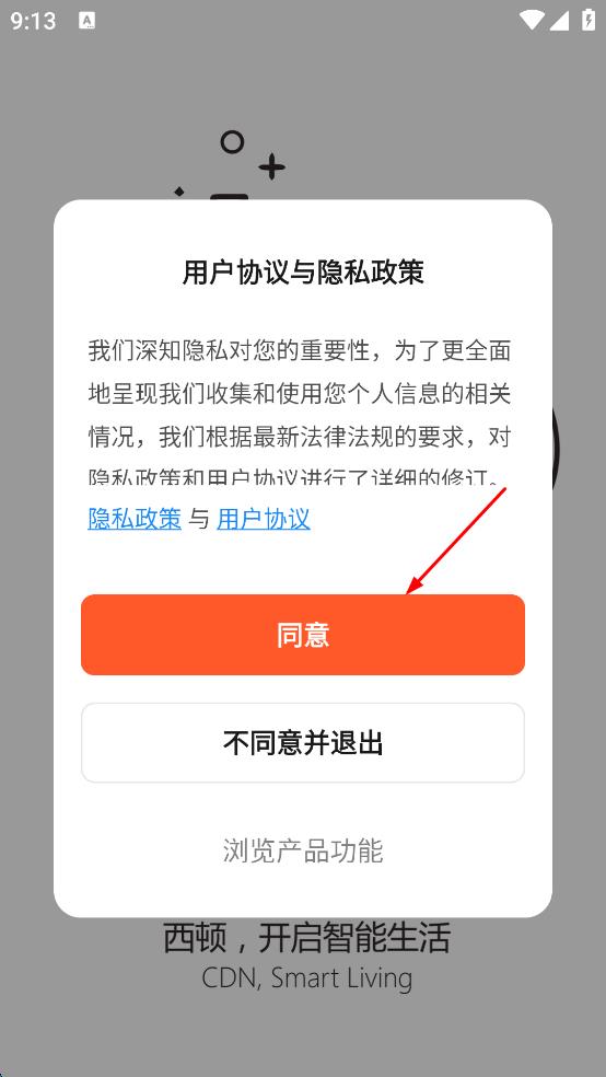 1、打开西顿智能生活软件,首先会弹出用户协议与隐私政策提示框,点击“同意”按钮,进入到登录注册界面。