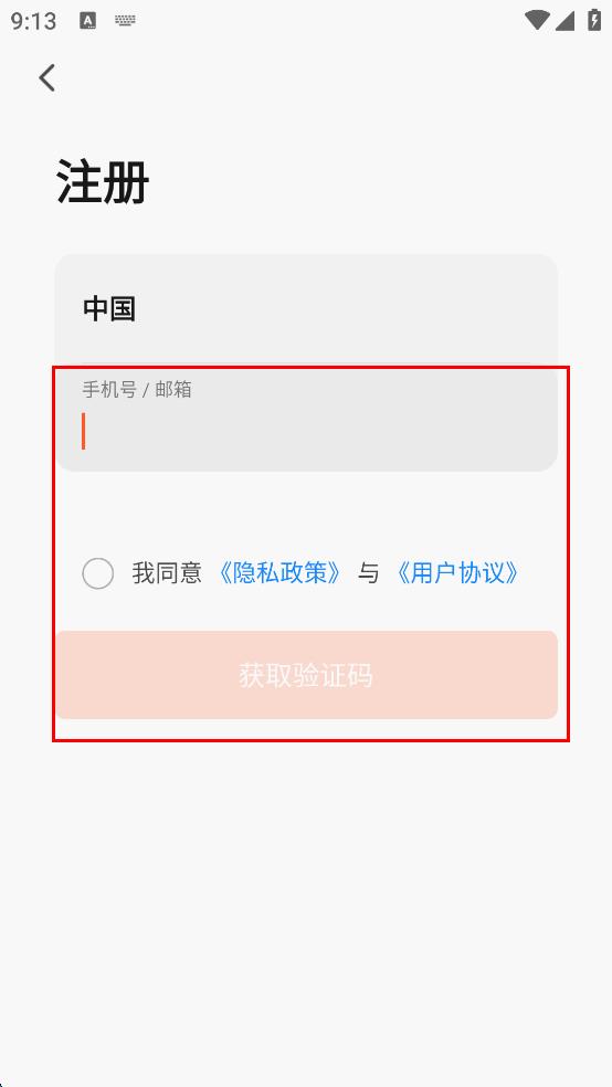 3、在注册页面里,输入手机号码后阅读同意协议,后点击获取验证码。