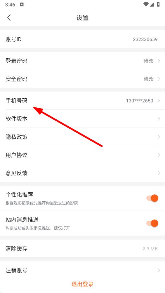 3、在设置页面,点击手机号码选项,进入更换手机号码。