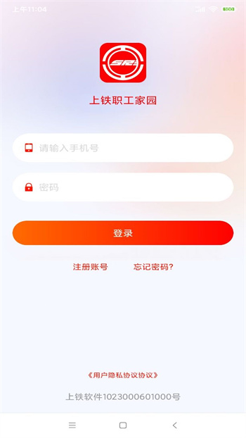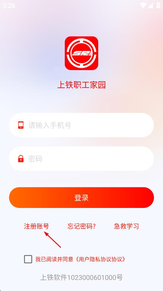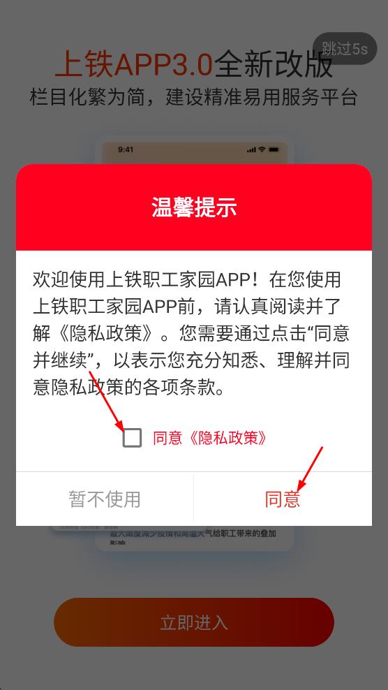 1、打开上铁职工家园APP,在弹出的“温馨提示”框中,勾选同意隐私政策,然后点击“同意”按钮,进入登录页面。