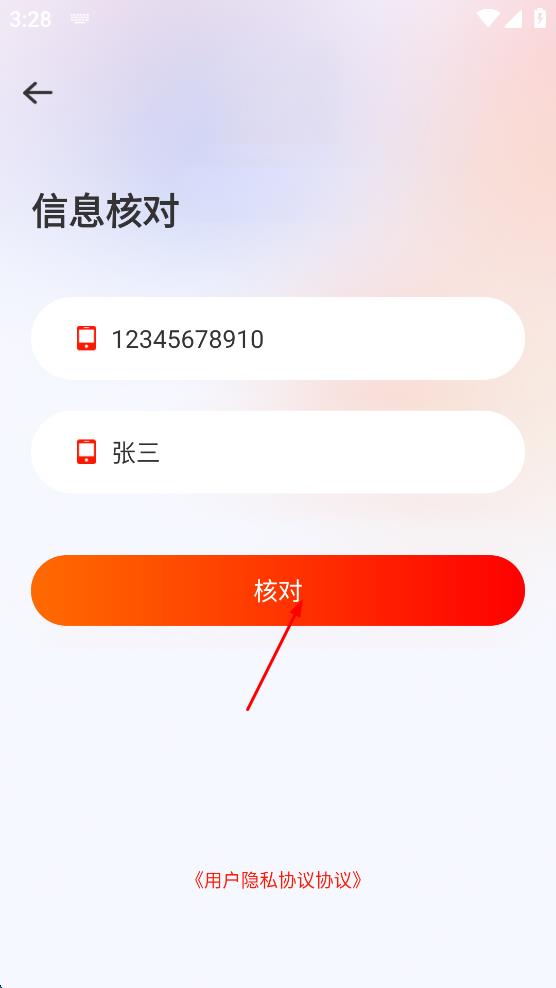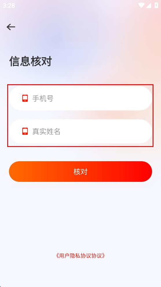 3、在信息核对页面,分别在“手机号”和“真实姓名”栏中输入自己的手机号和真实姓名。