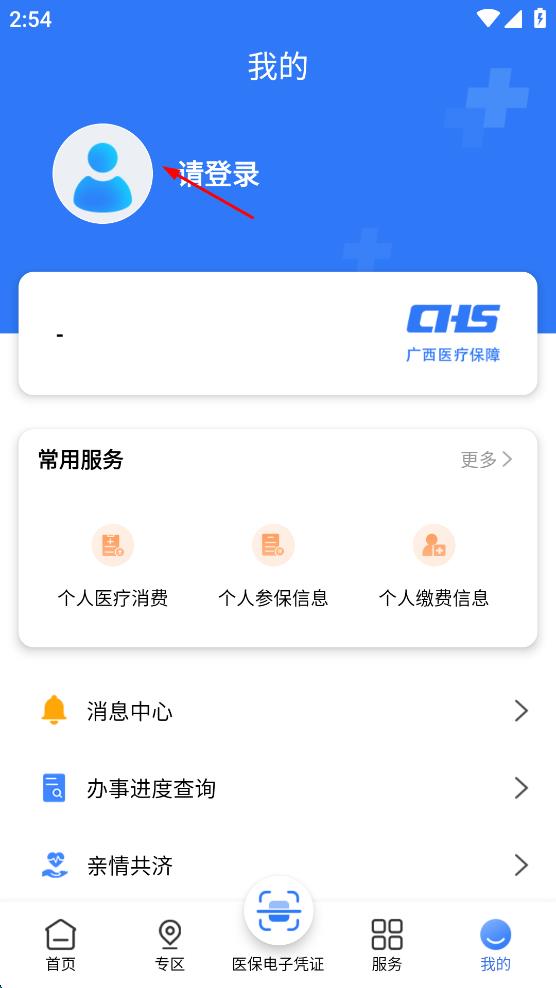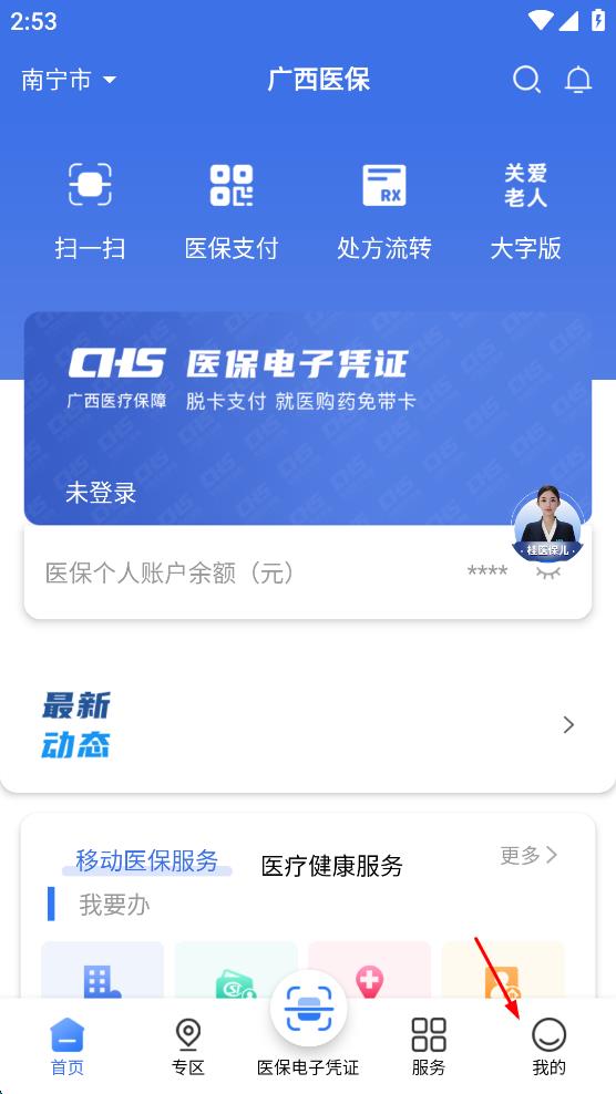 1、打开广西医保,进入首页后,点击页面右下角“我的”,进入个人中心页面。