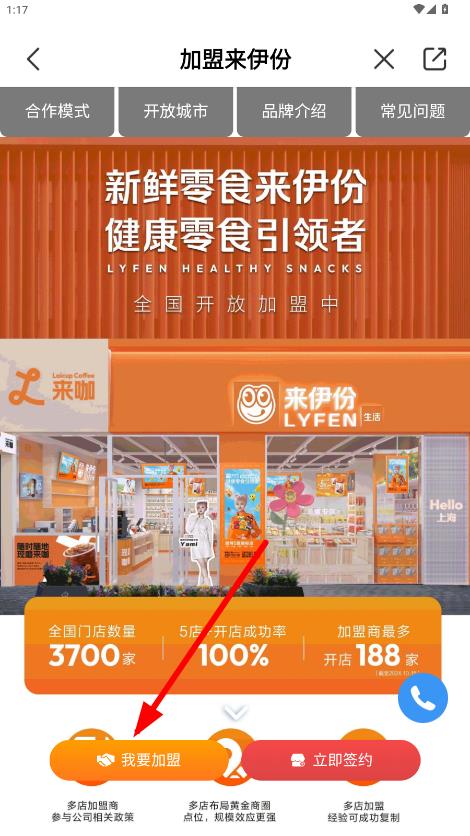 3、在加盟来伊份界面,查看相关介绍后,点击我要加盟按钮。