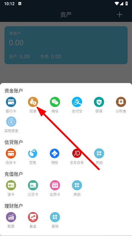 3、在资产类型选择框中选择现金,进入添加资产页面。