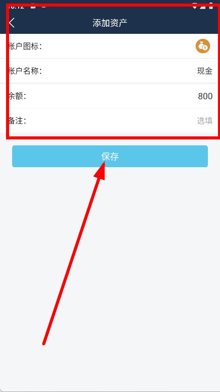 4、在添加资产页面填写账户名称、余额等信息后点击保存,完成资产添加。