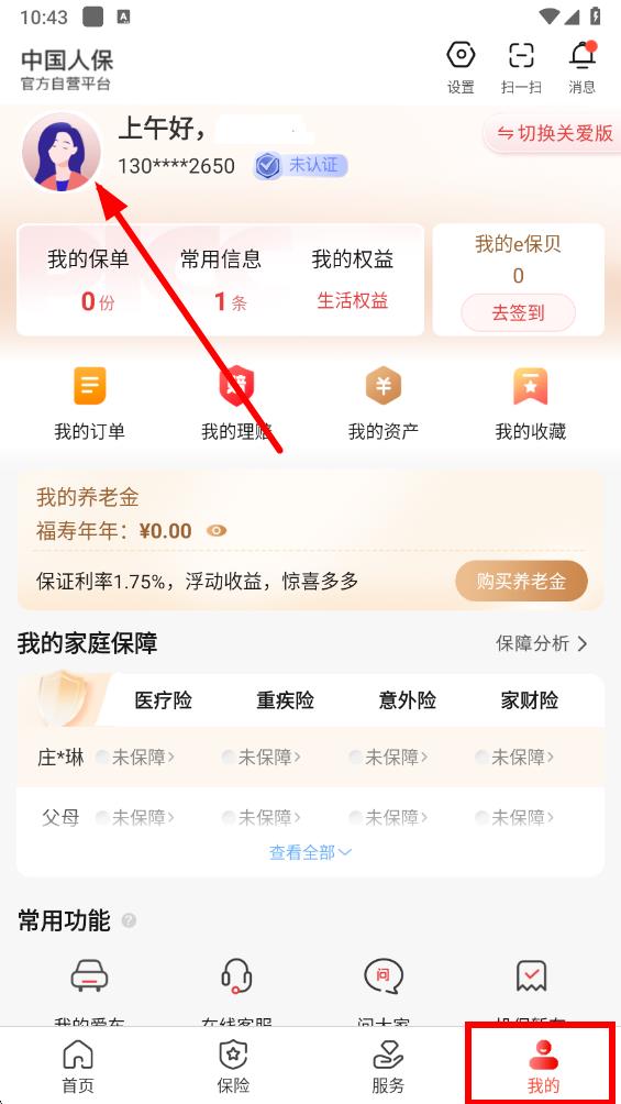 1、打开中国人保app,点击底部我的选项,进入个人界面,在界面左上角,点击头像进入个人中心页面。