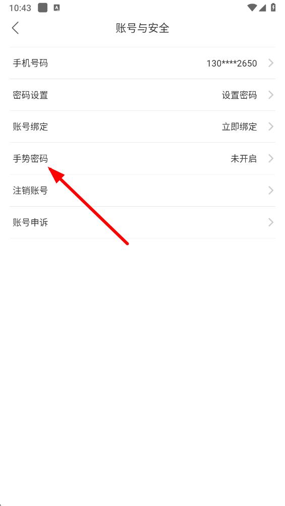 3、在账号与安全界面中,点击手势密码选项,进入手势密码设置页面。