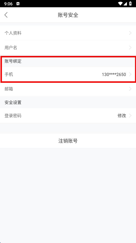 3、在账号安全页面,点击手机的选项进入手机号管理界面。